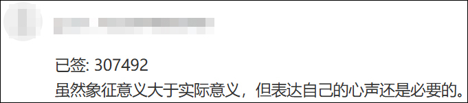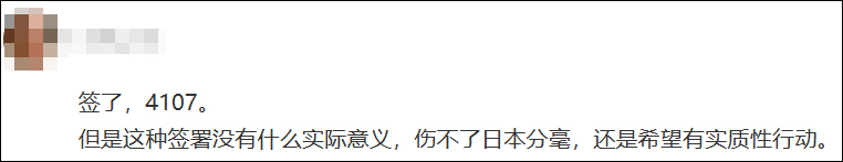 有个别网友认为:“这种签署没有什么实际意义,伤不了日本分毫,还是希望有实质性行动。”对此,有网友表示“虽然象征意义大于实际意义,但表达自己的心声还是必要的”。