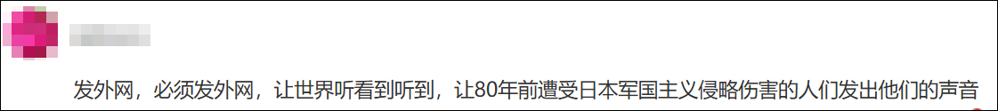 一名网友留言:“发外网,必须发外网,让世界听看到听到,年前遭受日本军国主义侵略伤害的人们发出他们的声音。”