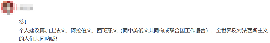 “签!个人建议再加上法文、阿拉伯文、西班牙文(同中英俄文共同构成联合国工作语言),全世界反对法西斯主义的人们共同呐喊!”另一名网友写道。