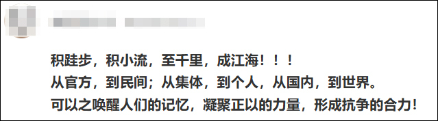 一名网友写道:“积跬步,积小流,至千里,成江海!从官方,到民间;从集体,到个人,从国内,到世界。可以之唤醒人们的记忆,凝聚正义的力量,形成抗争的合力!”