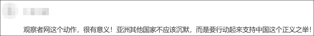 有网友评论:“观察者网这个动作,很有意义!亚洲其他国家不应该沉默,而是要行动起来支持中国这个正义之举!”