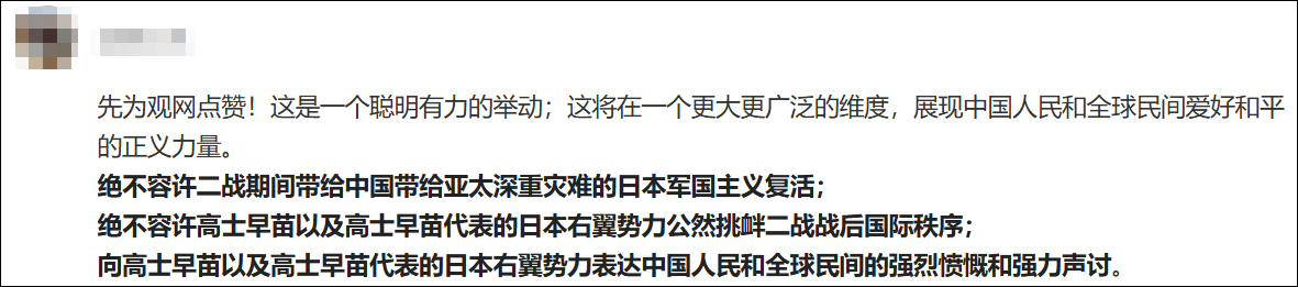 “绝不容许二战期间带给中国、带给亚太深重灾难的日本军国主义复活,绝不容许高市早苗及其代表的日本右翼势力公然挑衅二战战后国际秩序,向高市早苗及其代表的日本右翼势力表达中国人民和全球民间的强烈愤慨和强力声讨。”有网友强调。